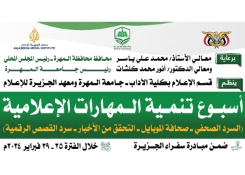 تدشن جامعة المهرة غدًا الأحد أسبوع تنمية المهارات الإعلامية بالشراكة مع معهد الجزيرة للإعلام خلال الفترة (25-29) فبراير الجاري. ويستهدف...