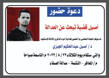 أعلنت اللجنة التحضيرية لإحياء ذكرى استشهاد الدكتور الشاب أصيل الجبزي، عن اقامة فعالية إحياء ذكرى استشهاد الشهيد الجبزي يوم غد...