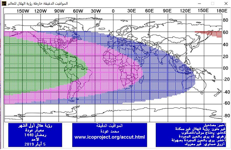 -المناطق الواقعة في اللون الزهري: رؤية الهلال ممكنة باستخدام التلسكوب، ومن الممكن رؤية الهلال بالعين المجردة في حالة صفاء الغلاف الجوي التام والرصد من قبل راصد متمرس.