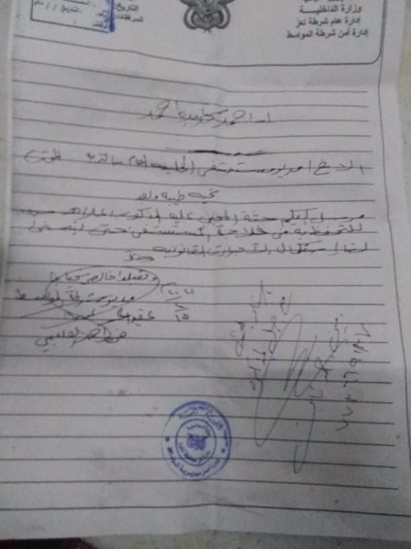 وأرسلت شرطة مديرية المواسط جثة الطفل المجني عليه إلى ثلاجة الموتى بمستشفى خليفة العام في التربة مركز مديرية الشمايتين، والتحفظ عليها ليتسنى استكمال التحقيقات الجنائية بحسب المذكرة الموقعة والممهورة بختم الشرطة في مديرية المواسط.