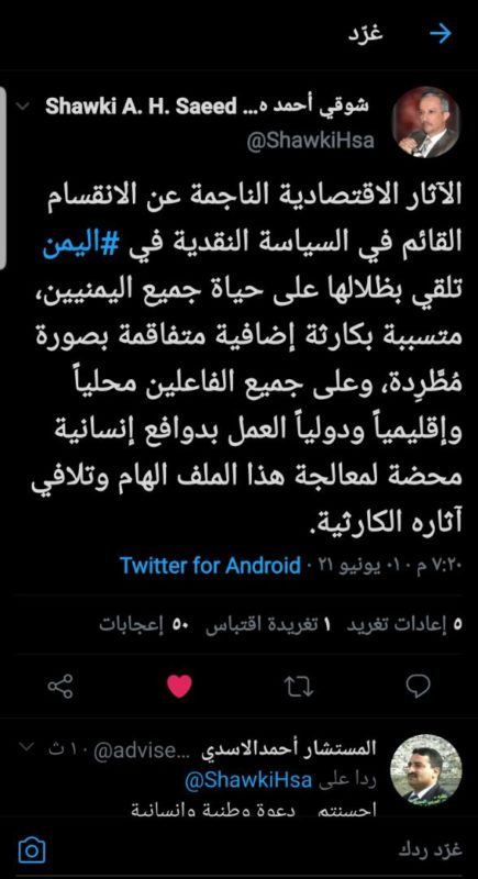 وأكد محافظ محافظة تعز الأسبق ورجل الأعمال البارز شوقي هائل أن آثار ذلك الانقسام القائم في السياسية النقدية باليمن _ يلقي بظلاله على حياة جميع اليمنيين ويتسبب بكارثة إضافية متفاقمة وبصورة مطردة ..