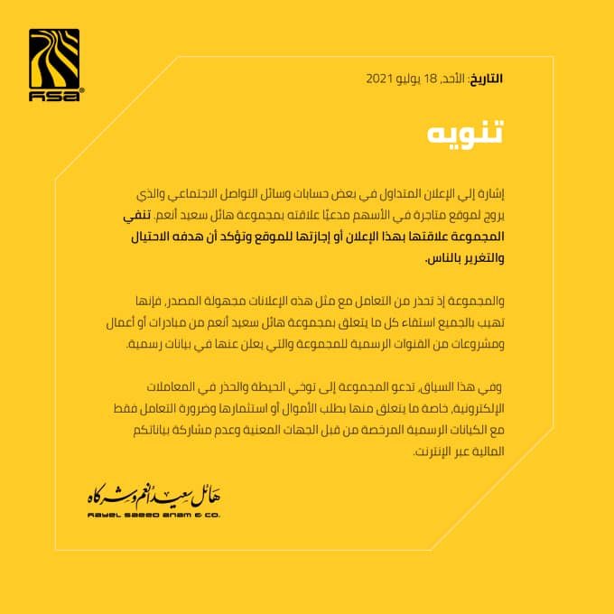 نفت مجموعة شركات هائل سعيد أنعم ما يروج له البعض في مواقع التواصل الاجتماعي عن علاقتها بموقع يتاجر في الأسهم.