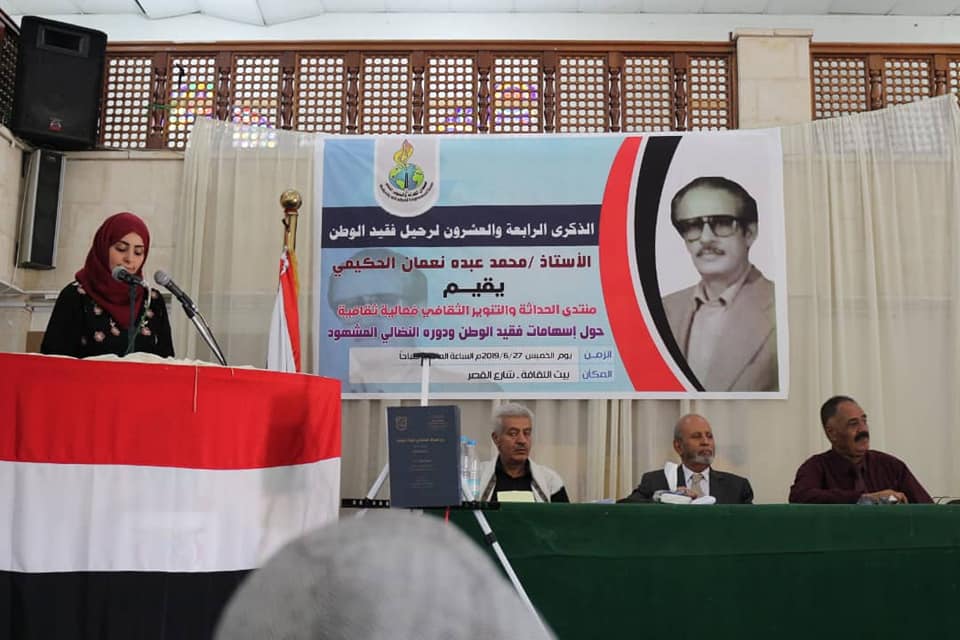وفي الفعالية التي أقيمت على رواق بيت الثقافة ونظمها منتدى الحداثة والتنوير الثقافي ألقى وزير الثقافة الأسبق الأستاذ يحيى حسين العرشي كلمة تحدث فيها عن علاقته المبكرة بالفقيد ومحطاته النضالية ودوره الثقافي والنقابي الفاعل في الحركة الوطنية وكيف كان يشكل إزعاجا للاستعمار في عدن إضافة إلى دوره الفاعل في إرساء دعائم الوحدة اليمنية