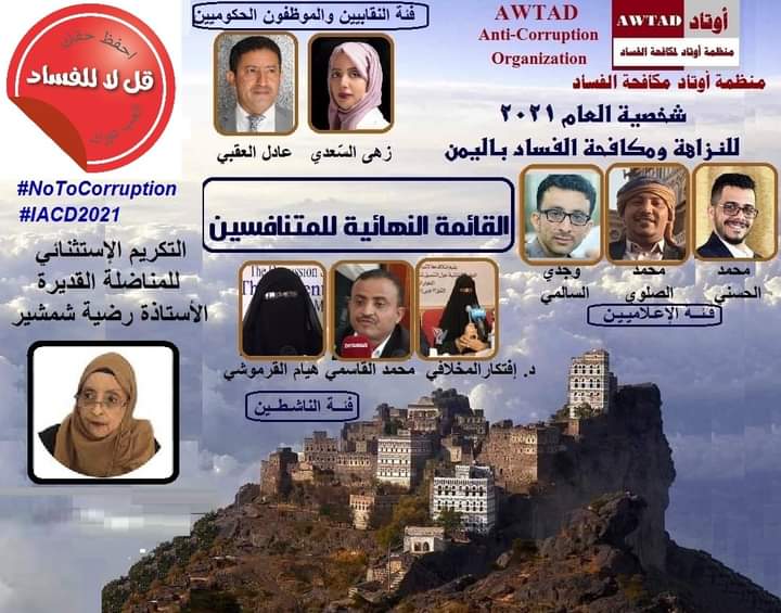 أعلنت منظمة أوتاد لمكافحة الفساد، عن قوائم المرشحين للفوز بشخصية العام للنزاهة ومكافحة الفساد باليمن، من نقابيون وناشطون وإعلاميون وقانونيون وأكاديميون وبرلمانيون وغيرهم من فئات المجتمع المدني، وطرحها للتصويت العام لاختيار شخص واحد من كل فئة ليكون شخصية العام .