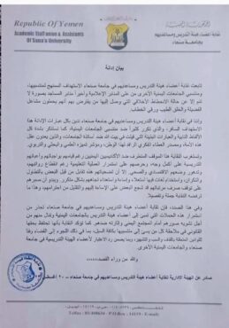 أدانت نقابة أعضاء هيئة التدريس ومساعديهم في جامعة صنعاء، الحملات التحريضية المتواصلة ضد منتسبيها من مختلف الجامعات اليمنية، والتي تشن عليهم من على المنابر الإعلامية ومنابر المساجد.