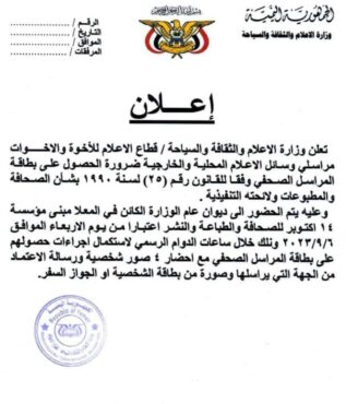 ودعت وزارة الإعلام الراغبين في الحصول على بطاقة صحيفة بالحضور إلى ديوان عام الوزارة الكائن في مبنى مؤسسة 14 أكتوبر للصحافة والنشر بالمعلا، وذلك اعتباراً من يوم الأربعاء الموافق 2023/9/6م، خلال ساعات الدوام الرسمي.
