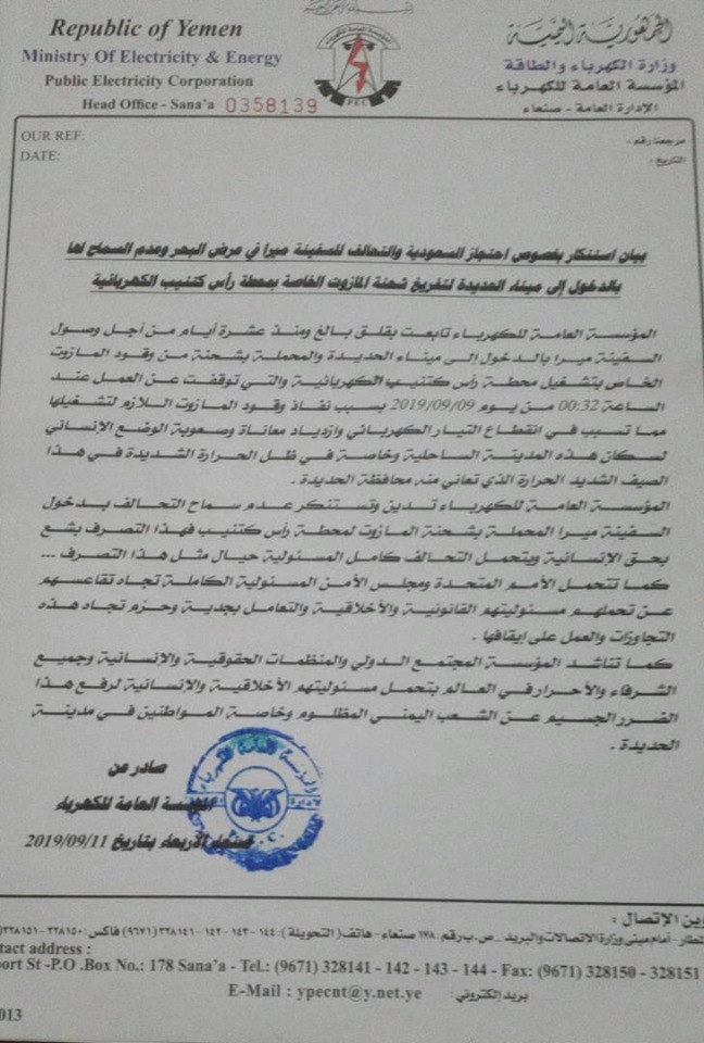 أطلقت المؤسسة العامة للكهرباء بيانا تستنكر فيه احتجاز السفينة ميرا ومنعها من الوصول إلى ميناء الحديدة وأشارت إلى أن السفينة ومحملة بشحنة وقود المازوت خاص بتشغيل محطة رأس كتيب الكهربائية..