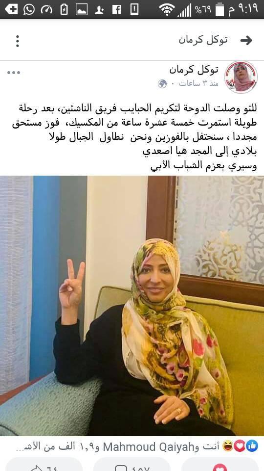 وصلت الناشطة اليمنية توكل كرمان الدوحة بعد رحلة طويلة وذلك لتكريم لاعبي منتخبنا الوطني للناشئين