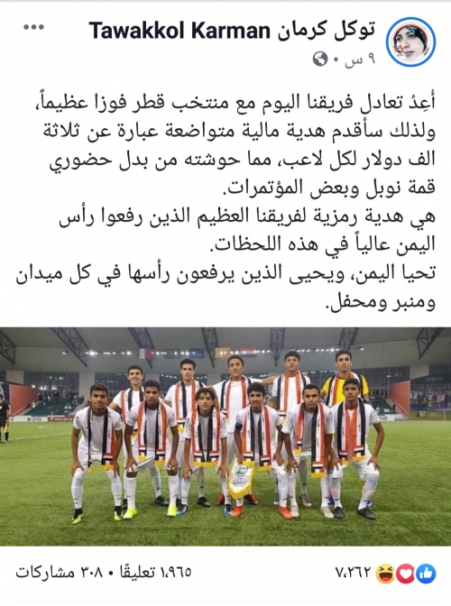 وكانت الناشطة اليمنية الحائزة على نوبل للسلام قد أعلنت في وقت سابق أنها خصصت جزء من مدخرات بدل سفر حضورها المؤتمرات الدولية لتحفيز منتخب الناشئين بعد التعادل الذي حققه امس أمام قطر واعتبرته هي بقيمة الفوز.