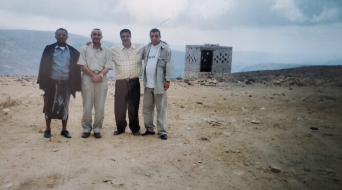 الصورة في راس حويرة ونحن في طريقنا إلى (خيلة) بدوعن حيث تمت استضافة الوفد في قصر بقشان التاريخي، قبل الانتقال إلى الهجرين ( دمون التاريخية) حيث احيا شعراء من الوفد أمسية شعرية في أحد مدارسها قبل تناول العشاء بضايفة أسرة بن محفوظ ولم نبت ليلتها إلا بسيئون.