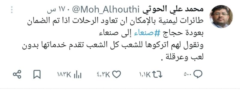 وأكد الحوثي في تغريدة له على صفحة الرسمية بمنصة إكس، إمكانية أن تعاود اليمنية رحلاتها إذا تم ضمان عودة حجاج صنعاء إلى صنعاء.