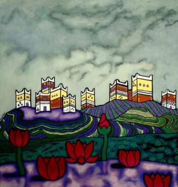 - رغبتها في تأكيد هويتها ويمنيتها في أعمالها من خلال استلهامها للعديد من الرموز المستجلبة من الموروث الشعبي وادخالها في فضاء العمل برؤية تجريدية واعية.