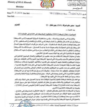 وكانت وزارة النفط والمعادن في عدن، وجهت مذكرة رسمية إلى مدير عام الشركة النمساوية في منتصف مارس الماضي، وضحت من خلالها مخالفة الشركة لاتفاقية الشراكة مع الجانب اليمني، رغم تعاون الوزارة معها وتسهيل أعمالها منذ بداية الحرب على اليمن عام 2015، لافتة إلى أن قراراتها الأخيرة تعد تنصلًا عن التزاماتها القانونية تجاه موظفيها من الكادر اليمني.