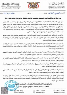 إننا في وزارة الاتصالات وتقنية المعلومات كجزء من أبناء شعب الإيمان والحكمة والجهاد، نؤكد على استمرارية الموقف اليمني الرسمي والشعبي المساند للشعب الفلسطيني المظلوم بكافة الوسائل المتاحة.