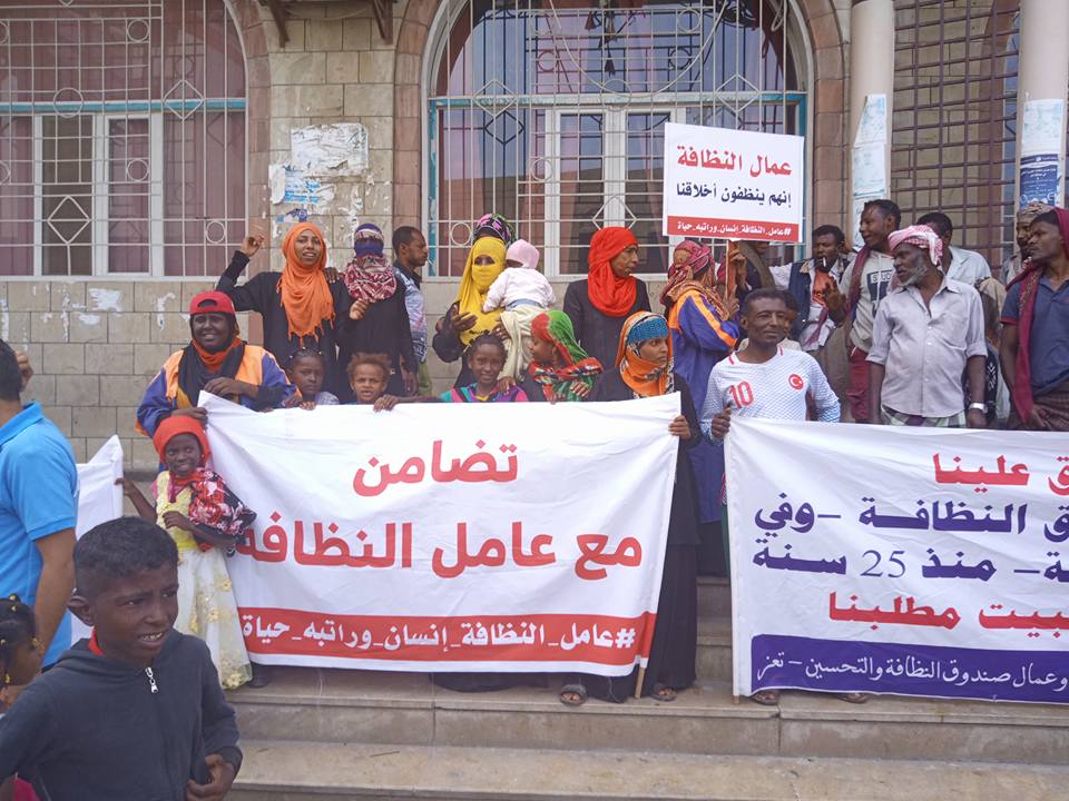 من الوقفة الاحتجاجية لعمال النظافة التي لا تزال مستمرة حتى اللحظة أمام المقر المؤقت للسلطة المحلية.