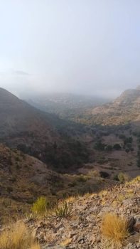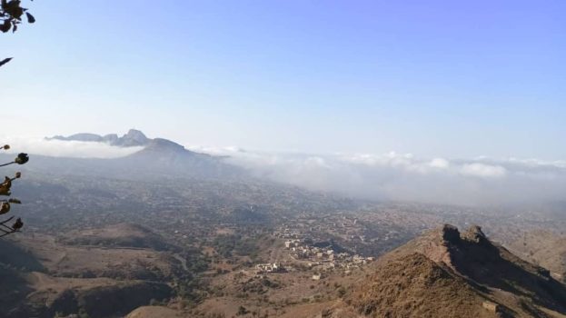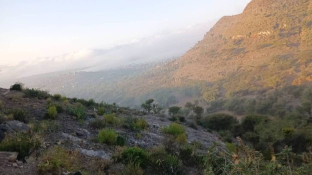 هبطنا من طريق غير مسلوك إلى معول ومنها استقلينا السيارة التي وضعناها صباحًا قبل صعودنا، حينها كانت الغمام تلك التي شكلت اطارًا خلفيًا جذابًا للصور المأخوة، قد بدأت في التلاشي التدريجي،