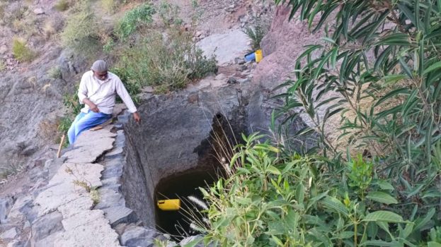 وجدنا الدلو الموضوع في مدخل هذه البركه مربوطًا في أعلى الفتحة بقفل، كدت أنسى ظاهرة الطفو الفيزيائية، فمادة البلاستيك المأخوذ منها الدول هي قنينه بلاستيكية ومعروف فيزيائيًا أن البلاستك يطفو على سطح الماء، لذا فإن القفل يعمل على جعل الدلو يغوص بين الماء حتى يمتلىء.