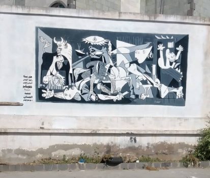 خصص الفنان التشكيلي الدكتور مفيد اليوسيفي هذه اللوحة لهذه المنطقة التي كانت أكثر دمارًا تحت نيران الحرب، كإدانه لكل حروب الطغاة ضد الإنسانية، ولم تكن منظمة الحزب الاشتراكي اليمني في تعز سوى هذه السبابة الوحيدة التي تشير إلى إدانة هذه الحرب.