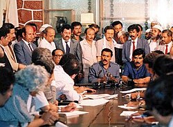 عقب التوقيع على اتفاق 30 نوفمبر 1989 عقد علي عبد الله صالح وعلي سالم البيض مؤتمرا صحفيا قال فيه علي صالح حرفيا: “لقد جئنا لإجراء حوار مع الإخوة في عدن حول إعادة تحقيق وحدة وطننا اليمني. وقد وجدنا من أشقائنا في قيادة الشطر الجنوبي كل التفهم، وتم إنجاز عمل عظيم وتاريخي كان معطلا من فترة طويلة حيث كانت هناك أوهام وشكوك كانت تغذيها قوى دولية تعيق تطلعاتنا الوحدوية، لكننا اليوم كبرنا وشبينا عن الطوق وشعرنا بمسؤولياتنا استجابة لضغط الجماهير التي تناشد وتهدر مطالبة بإعادة تحقيق الوحدة اليمنية”. وأضاف قائلا: “نحن نقوم بهذا العمل خدمة للجماهير ومراعاة لمشاعرها، ومن أجل هذه القضية مستعدون للتنازل عن مراكزنا القيادية وتركها للشعب ليختار قيادة بديلة إذا كنا غير صالحين”.