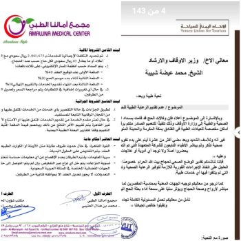 وبحسب العقد الموقع بين وزارة الأوقاف والإرشاد وبين أحد المجمعات الطبية في المملكة العربية السعودية، فإنه يلزم الأخير بتقديم ﺭﻋﺎﻳﺔ ﻃﺒﻴﺔ ﺷﺎﻣﻠﺔ ﻟـ 24,255 ﺣﺎجاً يمنياً ﻓﻲ ﻣﻜﺔ ﺍﻟﻤﻜﺮﻣﺔ، ﻭﺍﻟﻤﺪﻳﻨﺔ ﺍﻟﻤﻨﻮﺭﺓ، ﻭﺍﻟﻤﺸﺎﻋﺮ ﺍﻟﻤﻘﺪﺳﺔ، بدءاً من الـ19 من ﺫﻱ ﺍﻟﻘﻌﺪﺓ وحتى الـ23 من ذي الحجة.