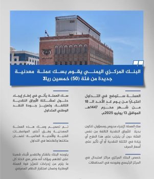 أعلن البنك المركزي اليمني بالعاصمة صنعاء، اليوم السبت، عن سك عملة معدنية جديدة من فئة (50) ريالًا، ووضعها في التداول اعتبارًا من يوم غدٍ الأحد الموافق 13 يوليو 2025م.