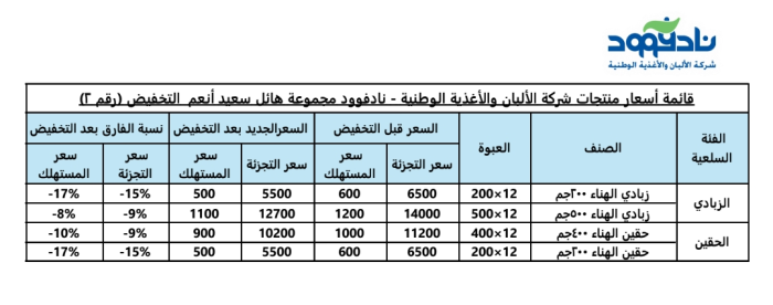 وبحسب القائمة الرسمية الصادرة عن الشركة، شملت التخفيضات الجديدة منتجات زبادي الهناء وحقين الهناء بمختلف العبوات، حيث بلغت نسبة التخفيض الجديدة 17% لأسعار المستهلك، و15% لأسعار التجزئة، ليصل إجمالي التخفيض مقارنة بالأسعار السابقة إلى 42%.