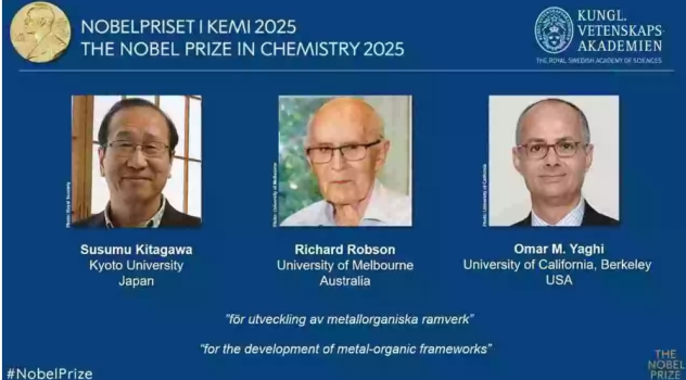 وفي فرع الكيمياء، نال الجائزة كلٌّ من سوسومو كيتاغاوا وريتشارد روبسون وعمر ياغي، تقديرًا لتطويرهم الإطارات المعدنية العضوية (MOFs)، وهي هياكل جزيئية دقيقة المسام قادرة على احتجاز الغازات والسوائل بانتقائية عالية، ما يفتح المجال أمام تطبيقات واعدة في تنقية المياه، وتخزين الطاقة، والحد من انبعاثات الكربون.