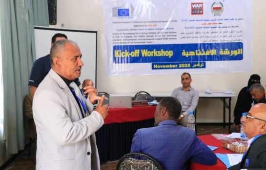 اختُتمت اليوم الثلاثاء بمحافظة تعز فعاليات الورشة التعريفية بمشروع “التعليم في الطوارئ (EiE)”، الذي نظمته منظمة طفل الحرب (War Child) بالشراكة مع جمعية بناء الخيرية للتنمية الإنسانية (BCFHD) وبدعم من الاتحاد الأوروبي (ECHO)، ضمن الجهود الرامية إلى تعزيز فرص التعليم للأطفال المتضررين من النزاع وتحسين بيئة التعلم الآمنة والشاملة.