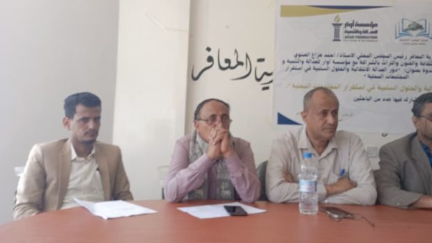 تحت رعاية مدير عام مديرية المعافر، الأستاذ أحمد هزاع الصنوي، نظم المركز اليمني الحديث للثقافة والفنون والتراث، بالشراكة مع منظمة “أوار” للعدالة والتنمية ومكتب الثقافة بالمديرية، ندوة فكرية نوعية تحت عنوان: “دور العدالة الانتقالية والحلول السلمية في استقرار المجتمعات المحلية”.