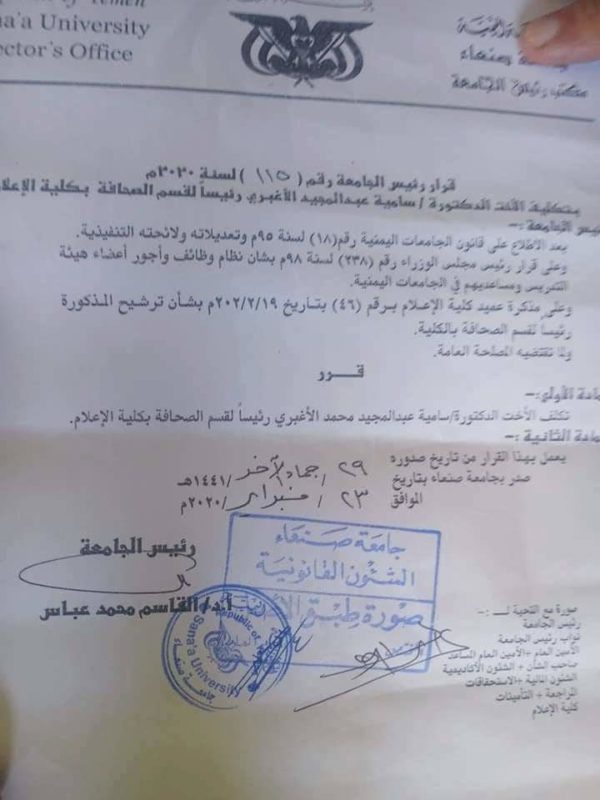 بالاستناد إلى قانون الجامعات اليمنية رقم (18) لسنة 95 أصدر رئيس جامعة صنعاء قرارا بتعين الدكتورة سامية عبد المجيد الاغبري رئيسًا لقسم الصحافية في كلية الإعلام، وتم هذا القرار بعد رفع مذكرة حول ترشيحها من قبل عميد كلية الاعلام الدكتور عمر داعر.
