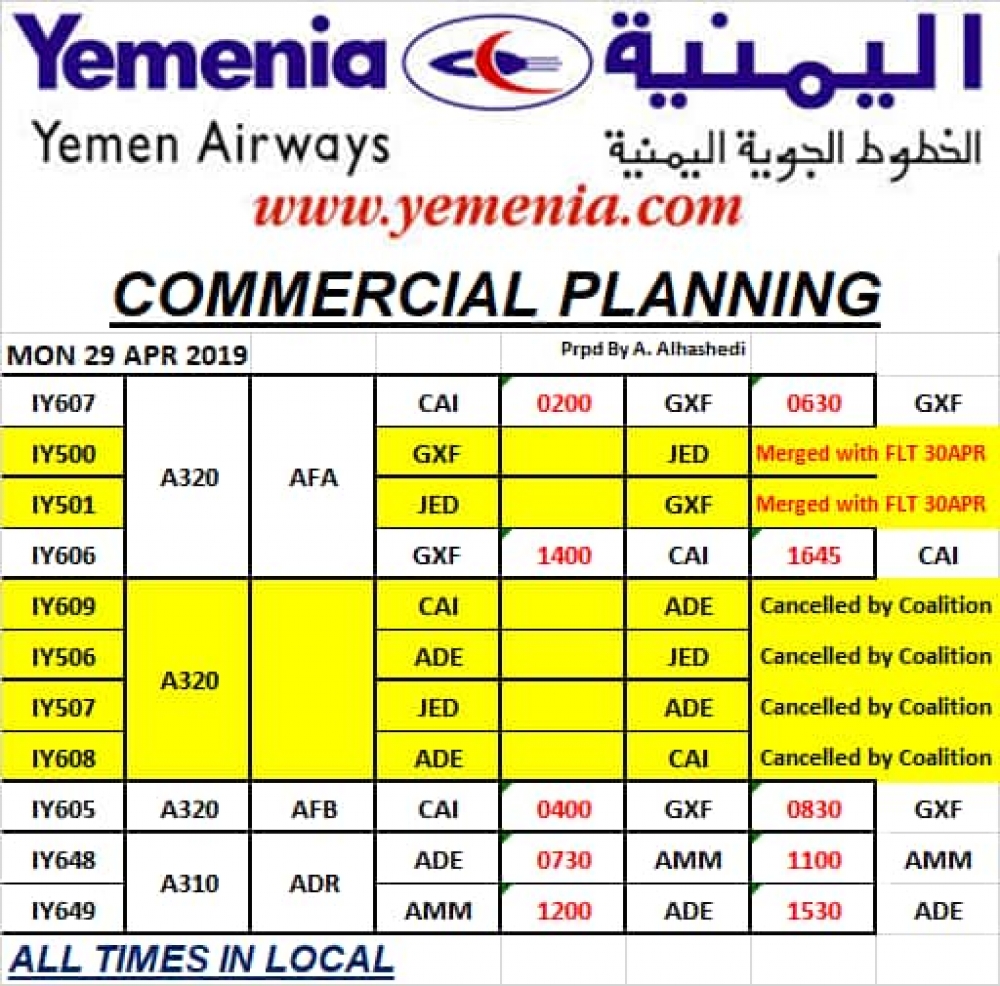 أكد مسؤلون في طيران اليمنية قيام التحالف بالغاء رحلاتها الى عدن يوم الاثنين دون ابداء أي اسباب، ونفت الشركة لعدن الغد ان يكون الالغاء سببه خلل فني أو خلافه، مؤكدة أن التحالف أغلق مطار عدن دون أسباب واضحة ومفهومة.