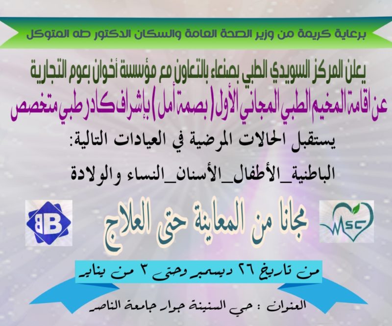 أعلن المركز السويدي الطبي بصنعاء عن اقامة المخيم الطبي المجاني الأول ( بصمة أمل ) بإشراف كادر طبي متخصص ورعاية كريمة من وزير الصحة العامة والسكان الدكتور طه المتوكل..