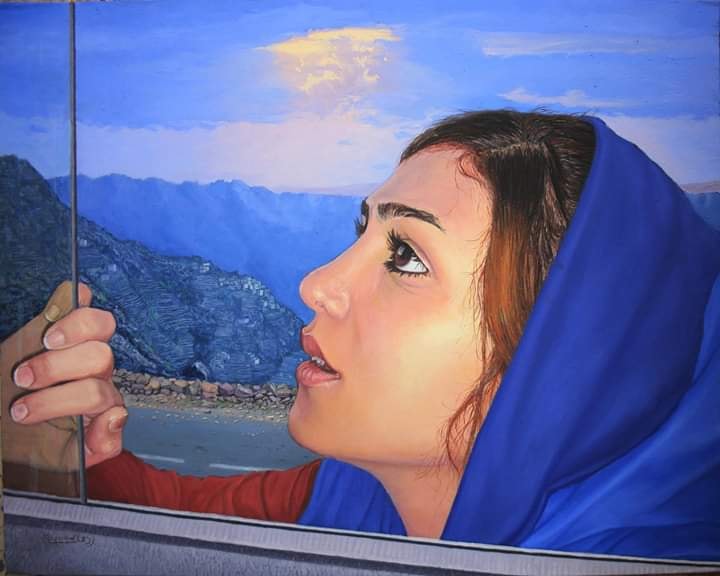 الأزرق بتدرجات مختلفة ليشكل الطبيعه من الخلف، يتخلل ذلك ذراع الفتاة